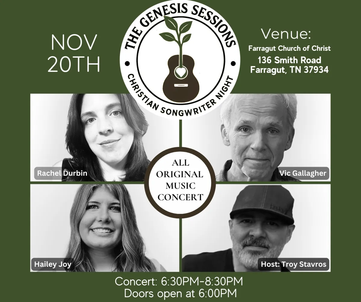 Hosted at the Farragut Church of Christ in Farragut, Tennessee, this FREE EVENT brings together talented Christian songwriters to share their heartfelt creations and the faith-filled journeys that inspired them.