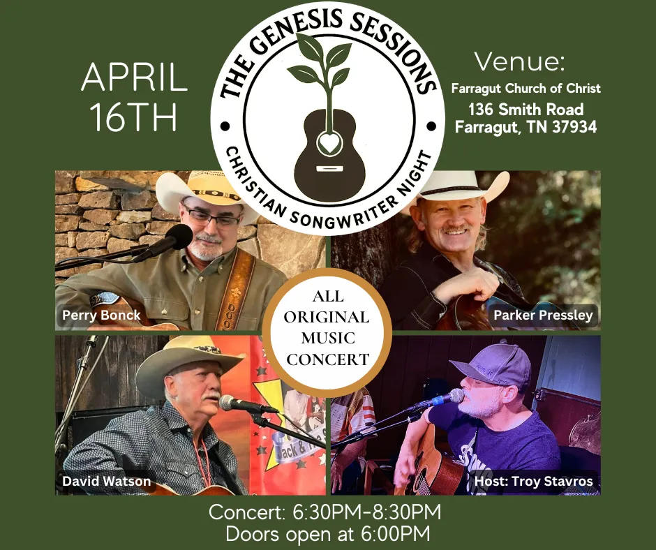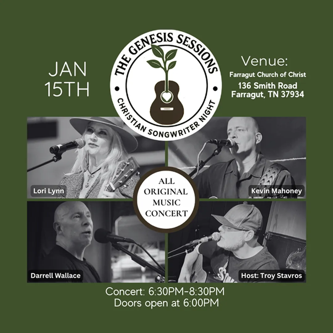 Hosted at the Farragut Church of Christ in Farragut, Tennessee, this FREE EVENT brings together talented Christian songwriters to share their heartfelt creations and the faith-filled journeys that inspired them.